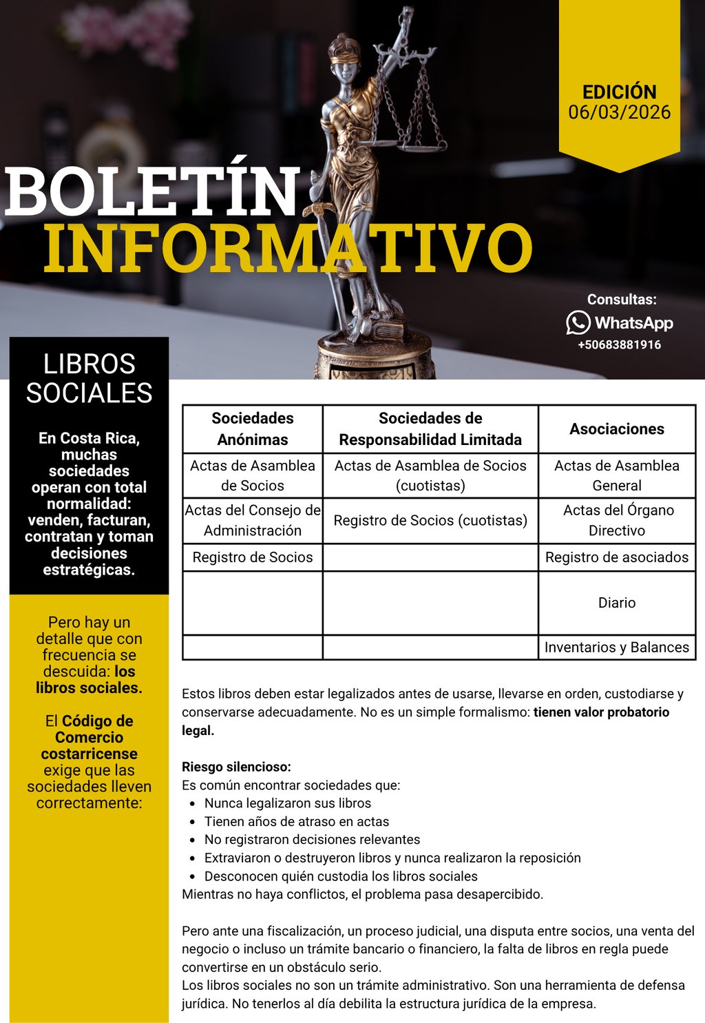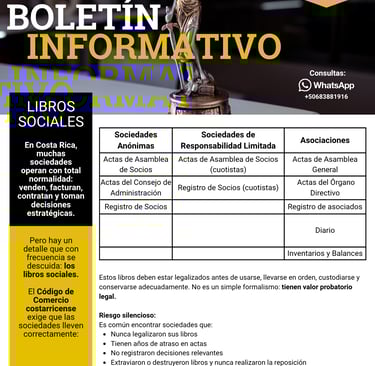 En RG Legal asesoramos a comerciantes y empresas en la revisión y regularización de sus libros sociales, con enfoque preventivo y estratégico. Una revisión oportuna puede evitar conflictos innecesarios en el futuro. Puede escribirnos directamente por WhatsApp: +506 8388 1916